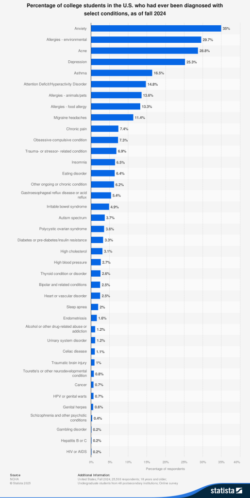 Researchers Karly Ball Issacson and Elizabeth Tuckwiller (2025) attest that college students with chronic illnesses face significantly heightened emotional challenges. Their study found that these students “experience higher rates of anxiety, depression, shame, and loneliness compared to their peers not experiencing chronic illness,” and that these mental health patterns shift depending on the type of illness. In other words, the burden is universal no matter the degree of struggle.